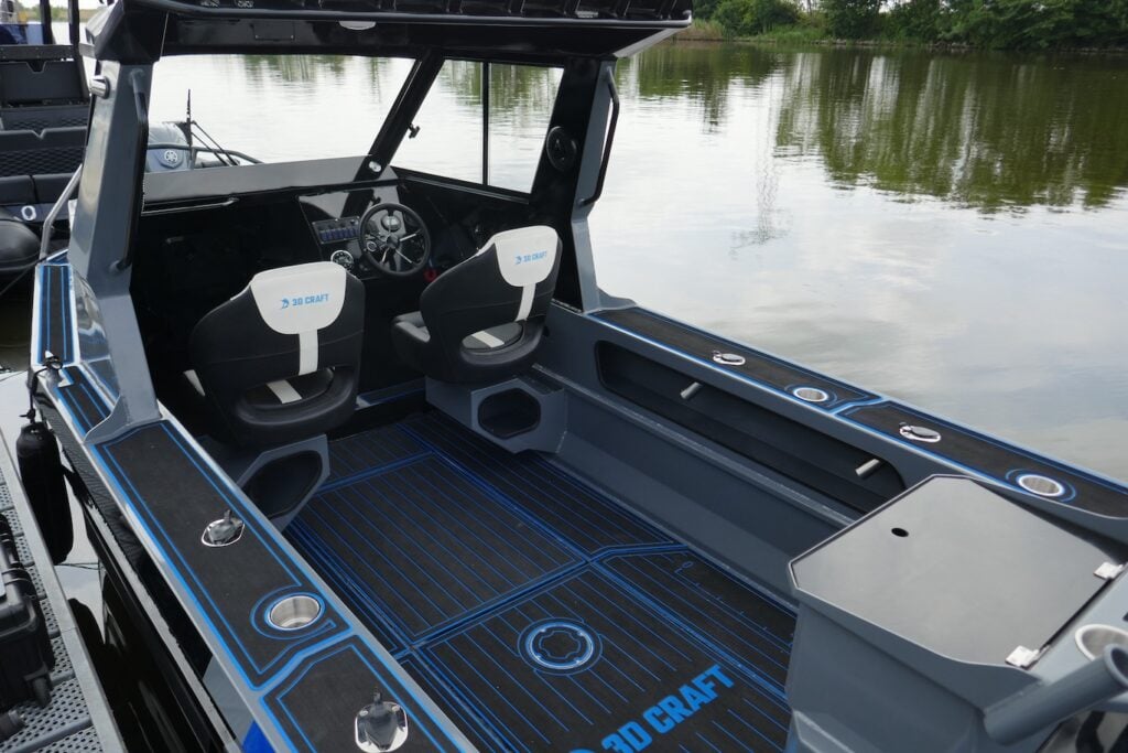 Het stabilisatiesysteem van de boot is bijzonder te noemen. Het werkt door een combinatie van luchtkamers en schuim. Bij zo’n zeevisboot horen ook hengelhouders, liefst een hele hoop. Aan het dak alleen al heeft deze 3D Craft Norden 600 er acht en dan heb je er ook nog vier in beide potdeksels plus twee achterop. Van de aanblik alleen al krijgen vissen koude rillingen.